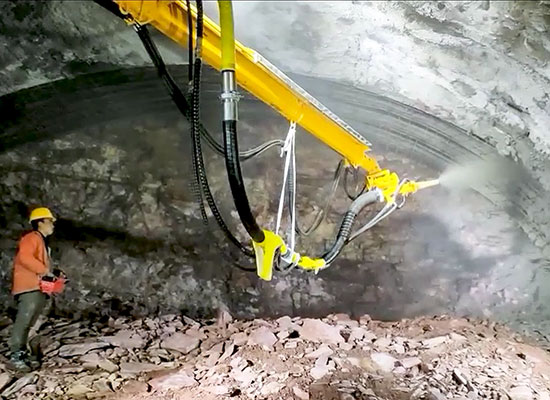 隧道施工濕噴混凝土設(shè)備主要有隧道濕噴機(jī)械手和普通濕噴機(jī)兩種。隧道濕噴機(jī)械手與普通濕噴機(jī)相比,具有機(jī)動(dòng)靈活自由、作業(yè)時(shí)間短、工作效率高、噴射量大、回彈小、作業(yè)勞動(dòng)強(qiáng)度低、安全,工序銜接緊湊等優(yōu)勢(shì)。